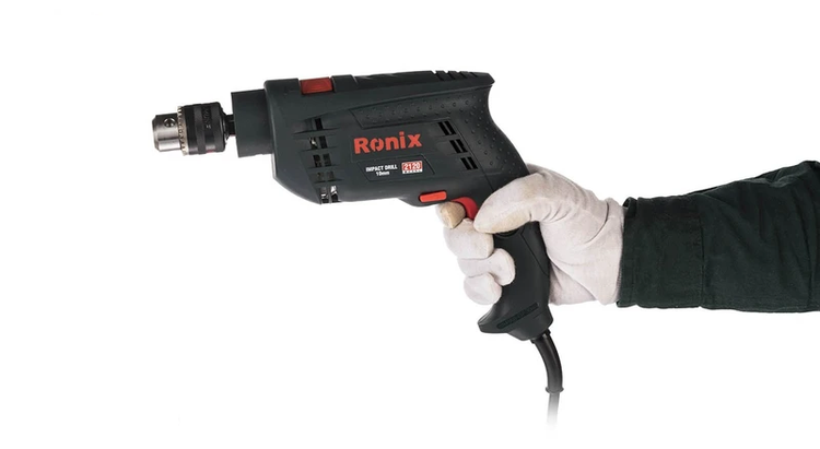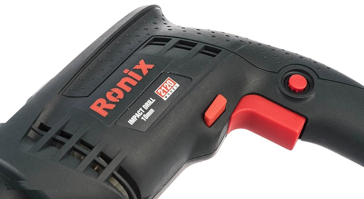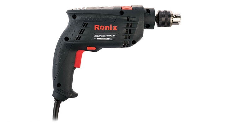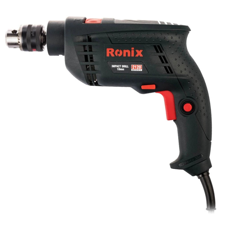 دریل ابزاری شناخته شده در صنعت است که برای سوراخکاری سطوح مختلف به کار گرفته میشود. محصول فوق دریل چکشی (Ronix) «رونیکس» با عنوان مدل (2120) است. این ابزار مناسب برای سوراخکاری معمولی و سوراخکاری ضربهای است و دارای طراحی و عملکردی مناسب است. از این ابزار میتوان برای سطوح چوبی، فلزی و بتنی استفاده کرد. حداکثر قطر سوراخکاری این دریل در چوب 20، در فلز 10 در مصالح نیز 10 میلیمتر است. وزن این چکش 1.6 کیلوگرم، توان آن 750 وات، ولتاژ ورودی آن 220 ولت و منبع تغذیه آن برق است. سرعت گردش آزاد این محصول 2800 دور بر دقیقه است، سیستم گردش چپ گرد و راست گرد دارد و دارای قفل سوییچ است. دریل چکشی رونیکس دارای قابلیت کنترل سرعت است. یک عدد آچار مخصوص باز و بسته کردن سه نظام جهت تعویض مته و دفترچه راهنما ارائه میشود.