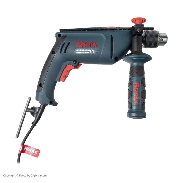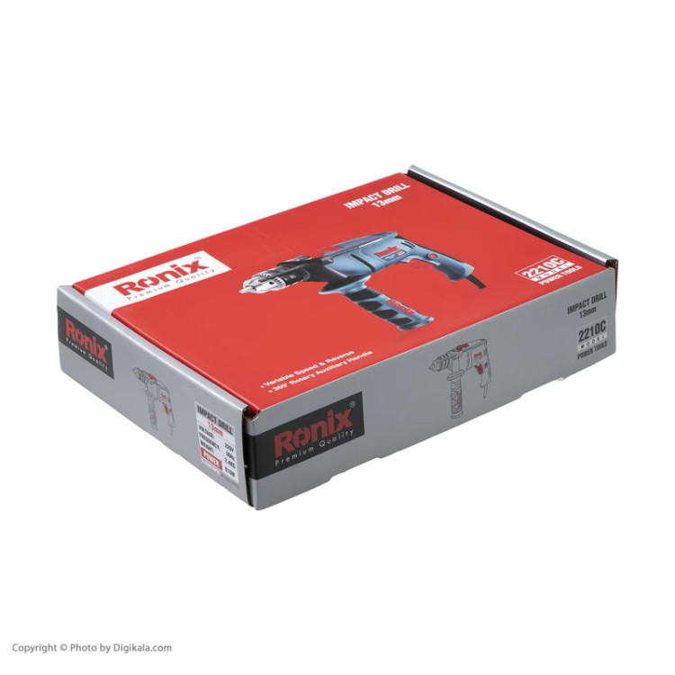 شرکت رونیکس روی این دریل چکشی از یک سهنظام آچارخور 13 میلیمتری استفاده کرده است. حداکثر قطر سوراخکاری این دستگاه روی چوب، فلز و مصالح بهترتیب