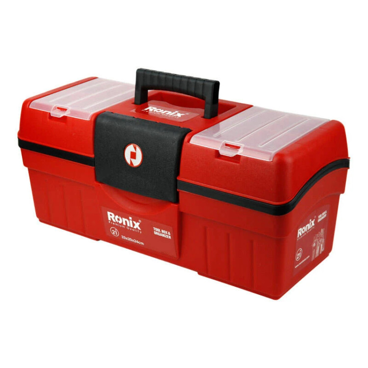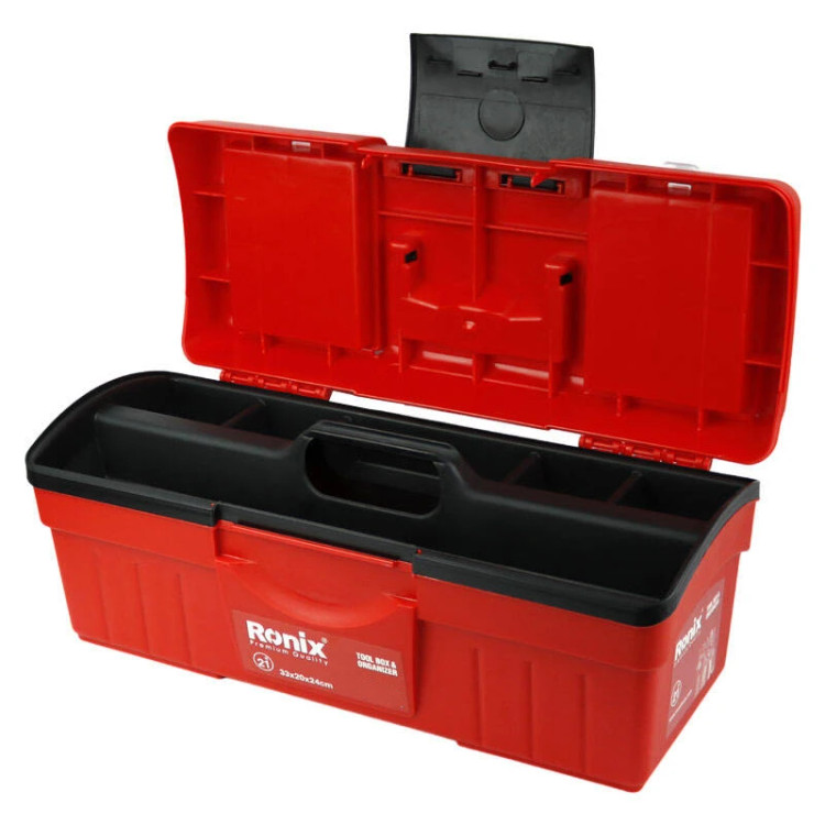 دارای بدنه ای مقاوم در برابر ضربه و فشار از جنس پلاستیک بهرمندی از یک عدد سینی پلاستیکی جهت نگهداری از آچار، چکش و … مجهز به ۲ محفظه بر روی درب و یک عدد سینی جدا شونده سایز ۲۱ اینچی به همراه دو لولای مقاوم و مجهز به قفل